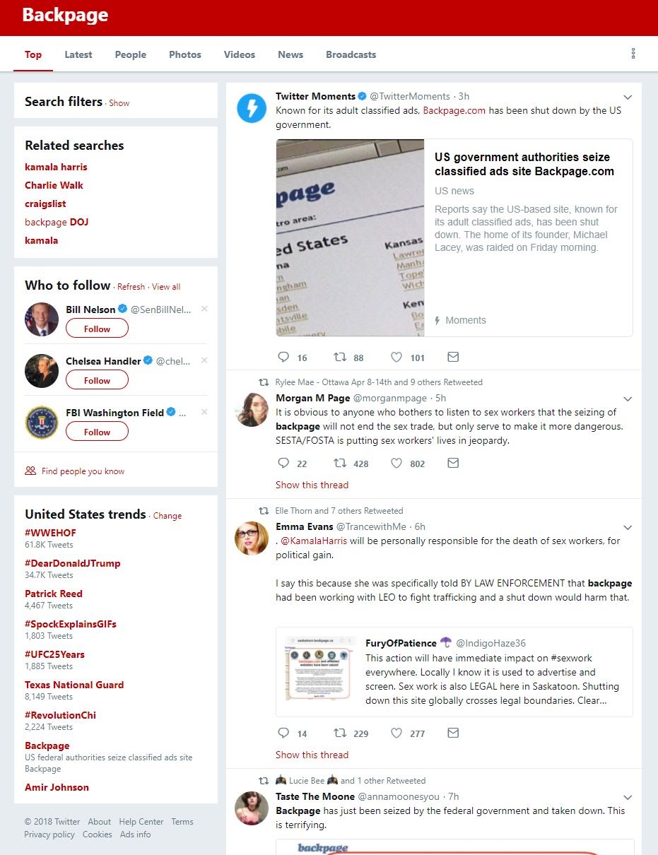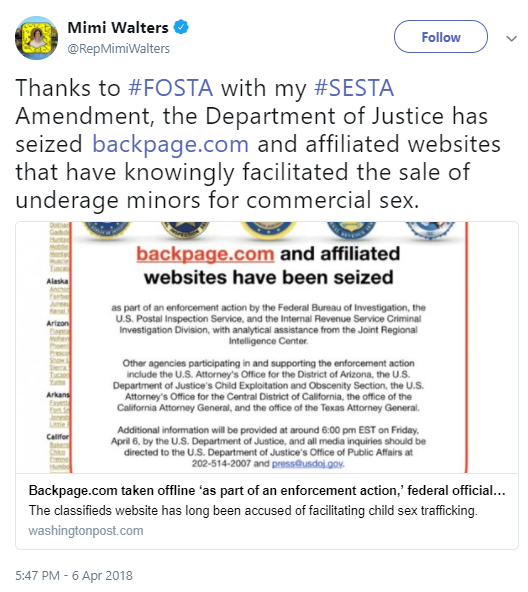 The passing of legislation like FOSTA/SESTA, aimed at sites that offer sex workers safe advertising, has been touted as a victory for trafficking survivors. But no additional funding was set aside for survivors and no new programs were created - instead the bill offered only additional criminal laws specifically mentioning facilitation of “prostitution”, clearly including consensual work. Evidence in the past suggested this approach would not help victims and today we are again seeing the terrifying stories sex worker advocates, internet freedom groups, and empirically informed anti-trafficking organizations feared play out. Bills that remove online resources for sex workers don’t fight trafficking, they increase it.
